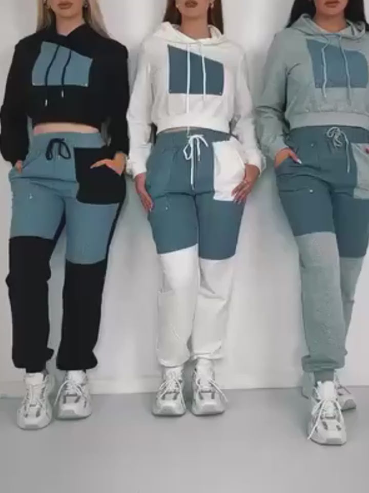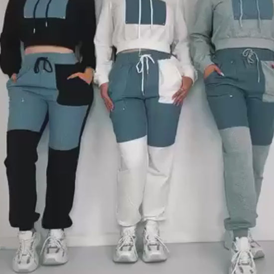 This patchwork jogger set features a button-down varsity-inspired crop jacket and high-waisted pants designed to accentuate your figure while keeping you comfortable all day. The subtle stripe hem detail elongates your silhouette, while the elastic waistband ensures a secure yet flexible fit. With functional side pockets, your phone, keys, or cards stay close at hand — perfect for life on the go.